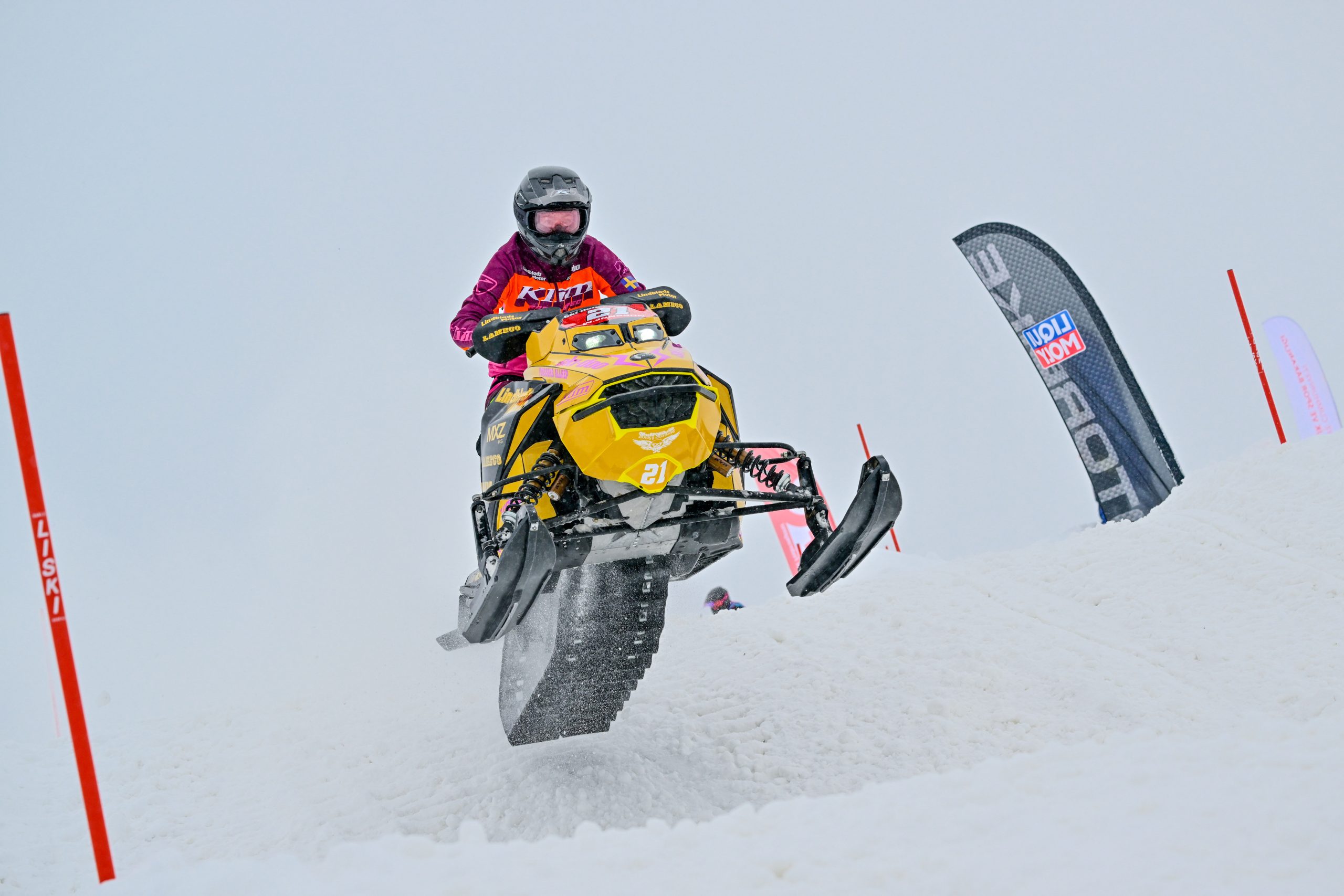 Race two saw no improvement in conditions for the ladies, with heavy snowfall continuing throughout the event. Wilma Jonsson grabbed the Holeshot once more and immediately took control at the front of the field.